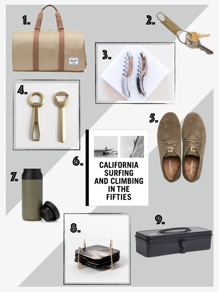 Herschel Duffle Bag // 2. Brass Key Ring // 3. Wine Key // 4. Solid Brass Bottle Openers // 5. Havana Suede Nomad Shoes // 6. California Surfing and Climbing in the Fifties // 7. Travel Tumbler // 8. Coasters // 9. Steel Toolbox